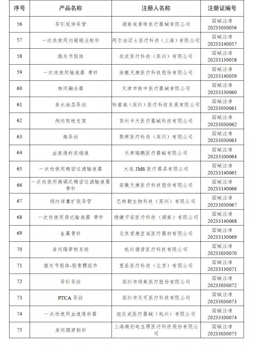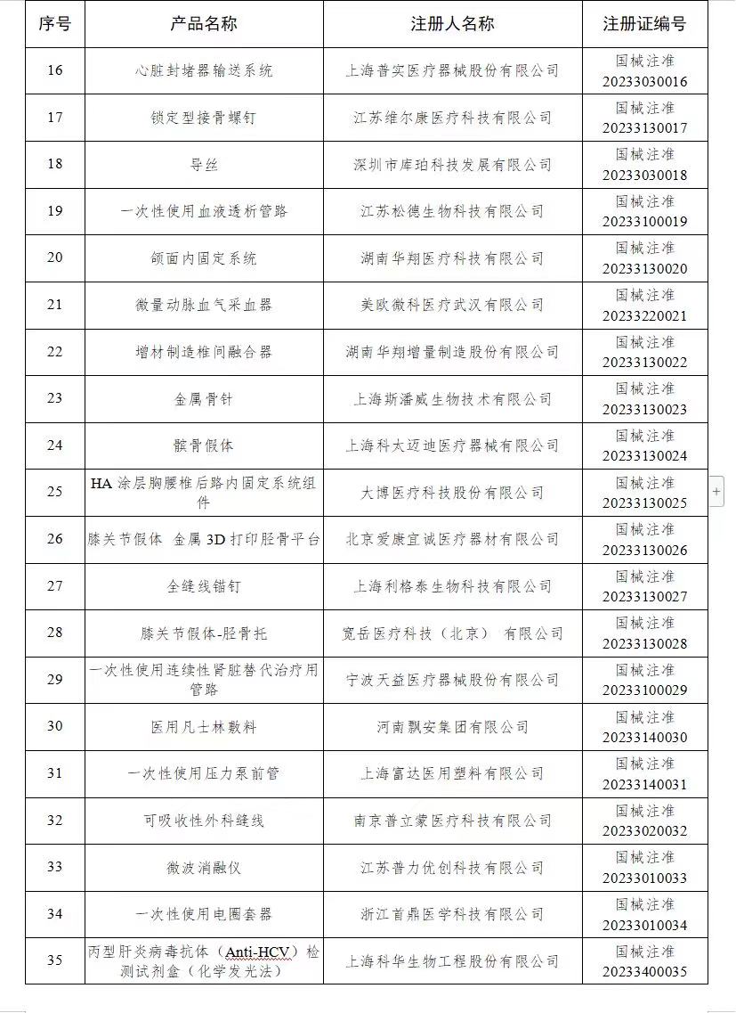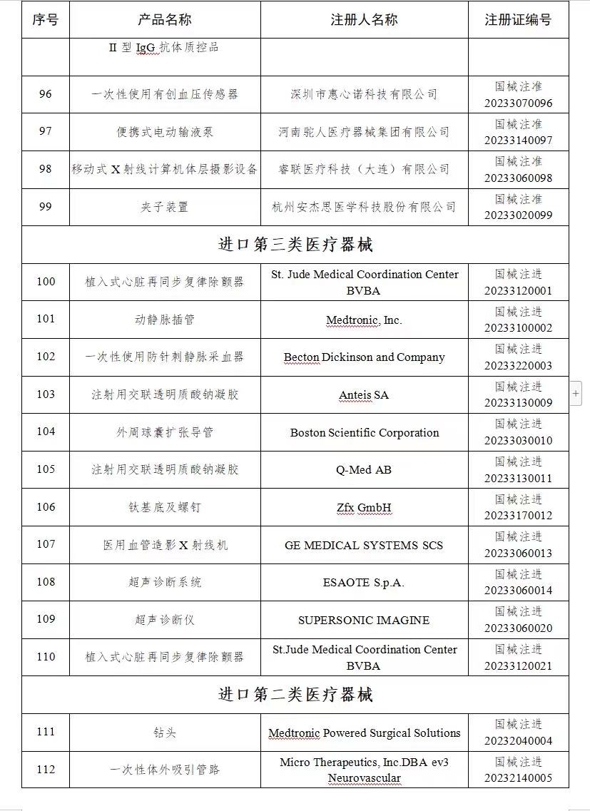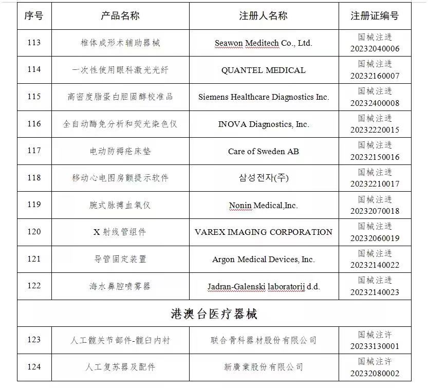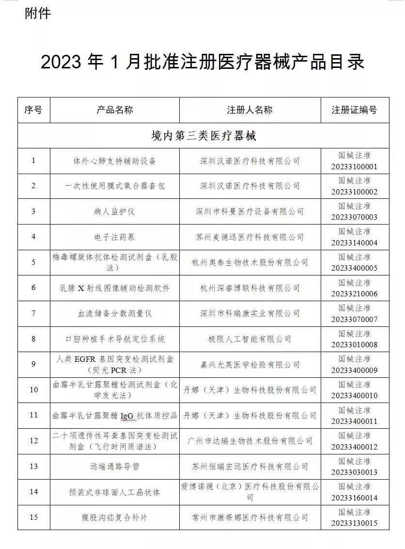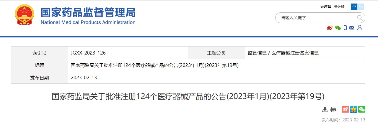 2023年1月,国家药监局共批准注册医疗器械产品124个。其中,境内第三类医疗器械产品99个,进口第三类医疗器械产品11个,进口第二类医疗器械产品12个,港澳台医疗器械产品2个(具体产品见附件)。