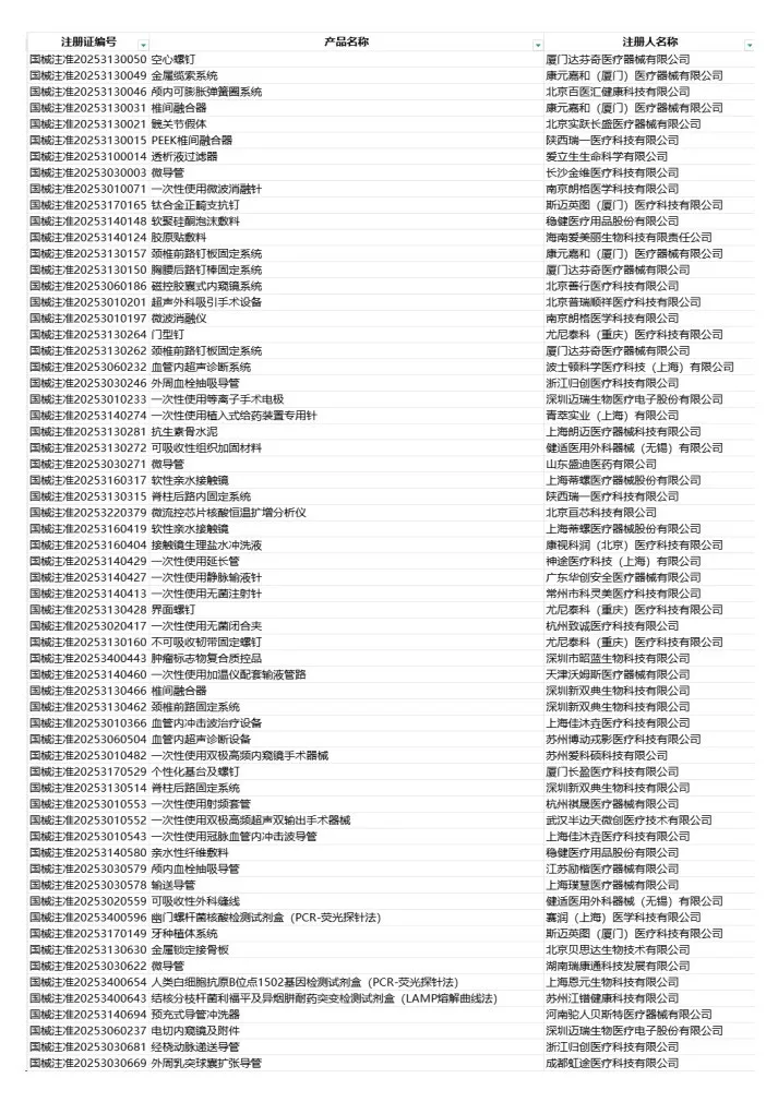 2025年第一季度,国家药品监督管理局共批准了63个医疗器械产品的注册申请。这些产品涵盖了骨科、心血管、眼科、外科、诊断设备等多个领域,显示出医疗器械行业的多样性和广泛性。从注册人住所和生产地址的分布来看,医疗器械企业主要集中在北京、上海、深圳、厦门、苏州等经济发达地区。这些地区的医疗资源丰富,科研实力强,政策支持力度大,为企业的发展提供了良好的环境。北京:15家企业,主要集中在海淀区和大兴区,占23.8%。上海:12家企业,主要分布在浦东新区和嘉定区,占19.1%。深圳:8家企业,主要集中在南山区和坪山区,占12.7%。苏州:5家企业,主要分布在高新区和工业园区,占7.9%。其他城市:共16家企业,分布在重庆、杭州、南京、武汉等地,占25.4%。这种地域分布反映了医疗器械行业的区域集中化趋势,但也显示出中小城市和区域的潜力有待进一步挖掘。-数量:6个产品,占9.5%。以上海为主。-主要产品:肿瘤标志物复合质控品(深圳市昭蓝生物科技有限公司)幽门螺杆菌核酸检测试剂盒(赛润(上海)医学科技有限公司)结核分枝杆菌利福平及异烟肼耐药突变检测试剂盒(苏州江镨健康科技有限公司)-特点:这些产品主要用于疾病诊断和监测,技术门槛较高,市场需求稳定。-数量:17个产品,占27%。以北京、江苏为主。-主要产品:血管内超声诊断系统(波士顿科学医疗科技(上海)有限公司)超声外科吸引手术设备(北京普瑞顺祥医疗科技有限公司)-特点:设备类产品技术含量高,涉及复杂的电子和机械系统,主要用于医院的诊断和治疗过程。-数量:25个产品,占39.7%。以江苏、浙江为主。-主要产品:一次性使用等离子手术电极(深圳迈瑞生物医疗电子股份有限公司)一次性使用冠脉血管内冲击波导管(上海佳沐垚医疗科技有限公司)一次性使用双极高频超声双输出手术器械(武汉半边天微创医疗技术有限公司)-特点:耗材类产品使用频率高,市场需求大,产品更新换代快。-特点:敷料类产品主要用于伤口护理,市场需求稳定,技术门槛相对较低。-数量:12个产品,占19%。以江苏、北京为主。-主要产品:颈椎前路钉板固定系统(厦门达芬奇医疗器械有限公司)-特点:无源产品通常不需要外部能源即可发挥作用,主要依赖于材料和机械结构,广泛应用于骨科和外科领域。在63个注册产品中,有19个产品在注册后发生了变更,主要涉及注册人住所和生产地址的变更。这些变更反映了企业对市场需求的快速响应能力,以及对生产布局的优化。- 住所变更:10个产品,主要从北京市海淀区迁至其他区域。- 生产地址变更:8个产品,主要从上海浦东新区迁至其他生产基地。- 其他变更:1个产品,涉及产品技术要求和适用范围的调整。通过对2025年第一季度医疗器械注册数据的分析,可以总结出以下行业趋势和挑战:1. 技术创新驱动:高附加值、高技术含量的产品逐渐成为主流,如微导管、磁控胶囊式内窥镜系统等。2. 区域集中化:企业主要集中在经济发达地区,但中小城市的潜力仍需进一步挖掘。3. 审批效率提升:国家药品监督管理局的审批效率显著提高,为企业的快速发展提供了保障。4. 市场竞争加剧:随着产品种类的增加,市场竞争将进一步加剧,企业需要不断提升产品质量和技术水平。2025年第一季度中国医疗器械行业的注册数据反映了行业的快速发展和技术创新。然而,区域集中化、审批效率和市场竞争等问题仍需关注。未来,企业应加强技术创新,优化生产布局,提升产品质量,以应对日益激烈的市场竞争,中国医疗器械行业有望在技术创新和市场扩展中实现可持续发展。- 椎间融合器(康元嘉和(厦门)医疗器械有限公司)- 颈椎前路钉板固定系统(厦门达芬奇医疗器械有限公司)- 血管内超声诊断系统(波士顿科学医疗科技(上海)有限公司)- 磁控胶囊式内窥镜系统(北京善行医疗科技有限公司)- 软性亲水接触镜(上海蒂螺医疗器械股份有限公司)- 接触镜生理盐水冲洗液(康视科润(北京)医疗科技有限公司)- 一次性使用等离子手术电极(深圳迈瑞生物医疗电子股份有限公司)- 超声外科吸引手术设备(北京普瑞顺祥医疗科技有限公司)- 肿瘤标志物复合质控品(深圳市昭蓝生物科技有限公司)- 幽门螺杆菌核酸检测试剂盒(赛润(上海)医学科技有限公司)以上分析基于2025年第一季度的医疗器械注册数据,旨在为行业提供参考和洞察。