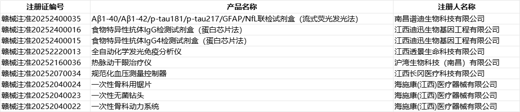 根据江西省药品监督管理局2025年1-3月发布的医疗器械注册数据,共新增9 个第二类医疗器械注册证,涉及6家注册人企业。