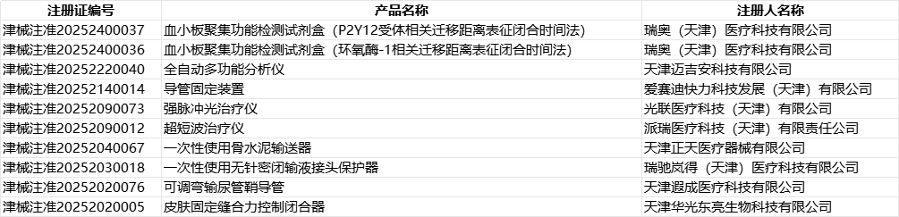 根据天津药品监督管理局2025年1-3月发布的医疗器械注册数据,共新增10个第二类医疗器械注册证,涉及9家注册人企业。