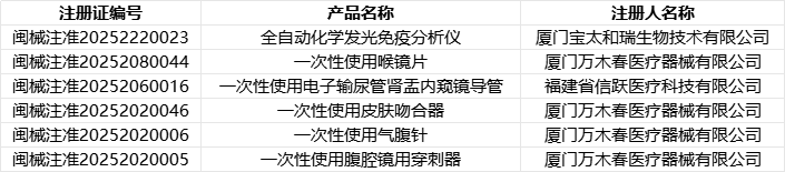 根据福建省药品监督管理局2025年1-3月发布的医疗器械注册数据,共新增6个第二类医疗器械注册证,涉及3家注册人企业。