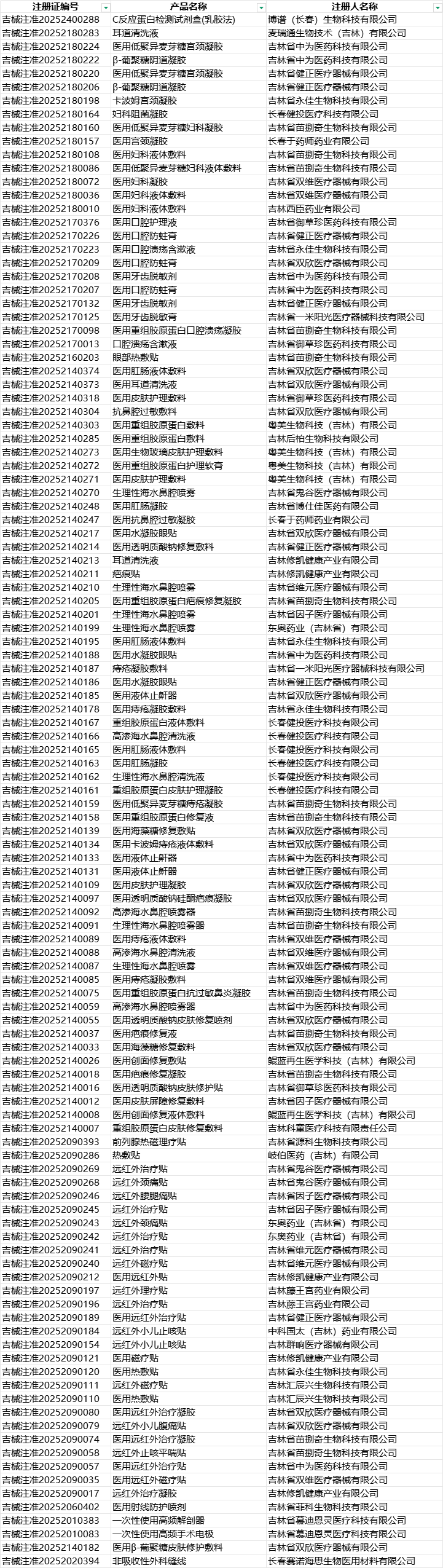 2025年上半年,吉林省二类医疗器械注册呈现出以敷料类产品为主导:占比超过72%,以妇科凝胶、口腔护理、皮肤修复类产品为主;跨省协作显著:约19.1%的产品委托至河南、辽宁、广东等地生产,形成跨区域产业链协同;长春为核心聚集地:近80%的注册人位于长春,依托多个产业园区形成集群效应;功能性产品突出:远红外贴、止鼾液、疤痕修复等产品具有明显消费医疗属性,适合家用市场。