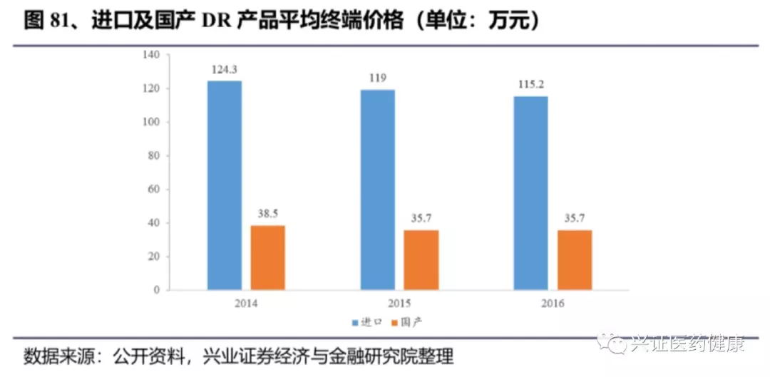 受分级诊疗、提升基层医疗机构服务能力等政策影响,未来DR市场的主要驱动力将来自于基层医疗机构,目前国内基层医疗机构由于预算有限,DR配置率较低,远未满足需求,同时基层医疗机构对产品价格比较敏感,科研需求少,加上国产DR产品操作系统更简单、界面更友好,更适合中国医疗工作者的使用,因此国产品牌更受青睐。2014-2016年,进口DR产品平均价格在100万以上,而国产DR产品的价格相对较低,近几年,国产DR的发展大大降低了进口产品的价格及维修费用,目前进口DR价格下降到60万左右,约为国产的二倍。