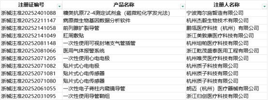 根据浙江省药品监督管理局2025年1-3月发布的医疗器械注册数据,共新增12个第二类医疗器械注册证,涉及10家注册人企业。