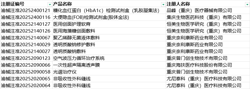 根据重庆药品监督管理局2025年1-3月发布的医疗器械注册数据,共新增12个第二类医疗器械注册证,涉及7家注册人企业。以创面护理敷料(占比41.7%)为主,其次为体外诊断试剂(IVD)和物理治疗设备。生产协作地本地(重庆)生产占比58.3%,跨省委托涉及陕西、厦门等地。